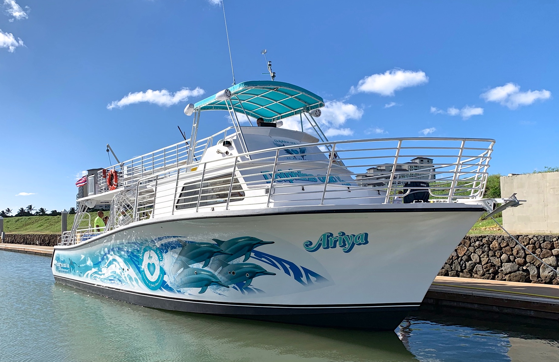 この最新型のツアーボートは、ドルフィン&ユーのツアーに合わせてカスタムメイドで作られたオリジナルのボートになります。ボートの長さは、55フィート(約17メートル)、横幅18フィート(約5.5メートル)、2階デッキがあり、90名のお客様を運ぶことができます。(海に入りたくない方の為にドルフィンウオッチングツアーも企画中です)広々とした2階デッキでは、広大な海で海洋生物を見学するには理想的な作りとなっています。また、船首部分のフロンドデッキからもハワイの素晴らしい景色を堪能できます。