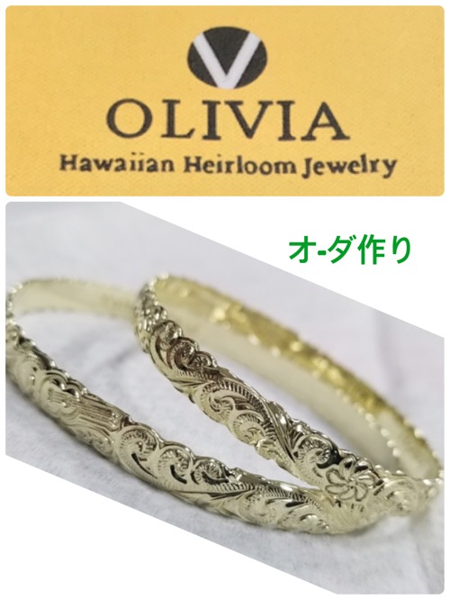 グリーンゴルドバングルにウクレレチアレ彫りオ-ダ作り内側にメセジも彫りましたー