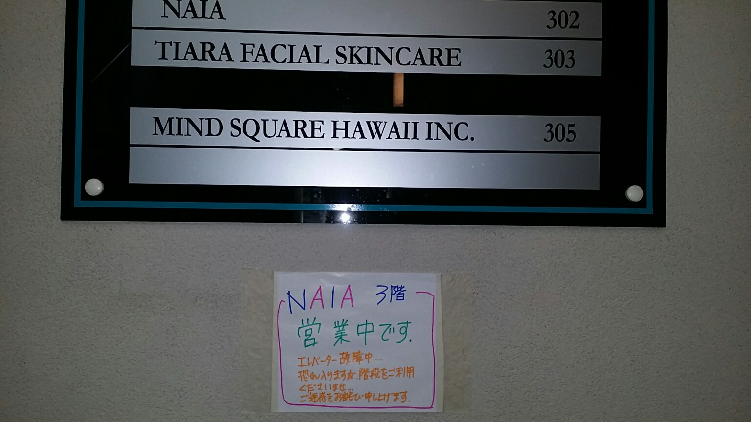 345ビルエレベーターが、昨日より故障となっておりますが、naiaは、営業いたしております。 お手数ですが、階段のご利用をお願いできましたら幸いです… ご迷惑をお詫び申し上げます… _(._.)__(._.)__(._.)_ Tギャリアトロリー乗り場向かい 345ビル 三階 naia