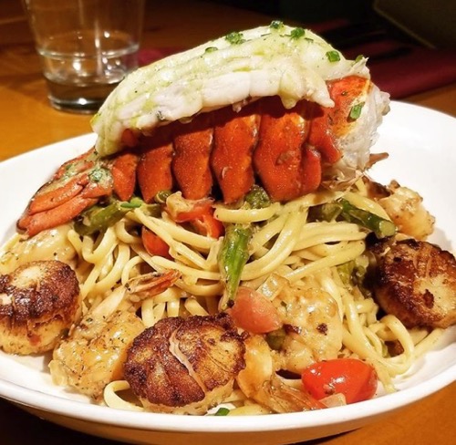ロブスターとホタテが豪快にのったシーフードパスタ。