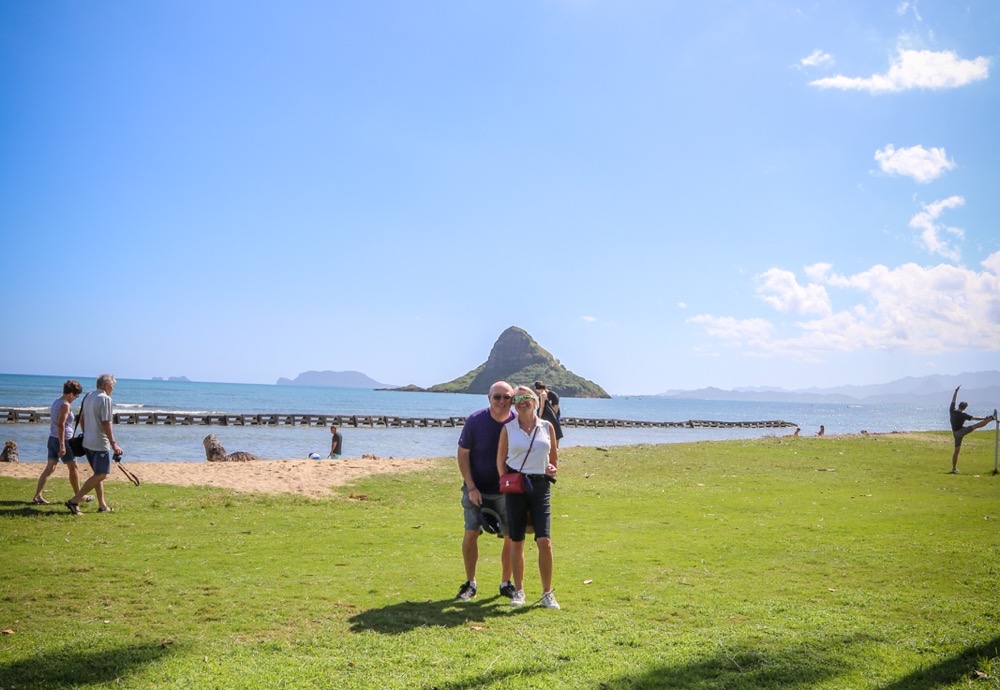 ここは、ハワイ諸島最大の聖地と言われているクラロア地区です。海から吹いてくる風が本当に気持ちのいい場所です。そして、クアロアビーチからは、チャイナマンズハットの相性で呼ばれる小島が見えます。プランテーション時代に中国人が被っていた帽子の形にそっくりだからだそうです。アイランド&ユーのオアフ島一周ツアーの定番インスタスポットにもなってます。この写真、二人で一つの帽子をかぶるの図です。かわいいですね。