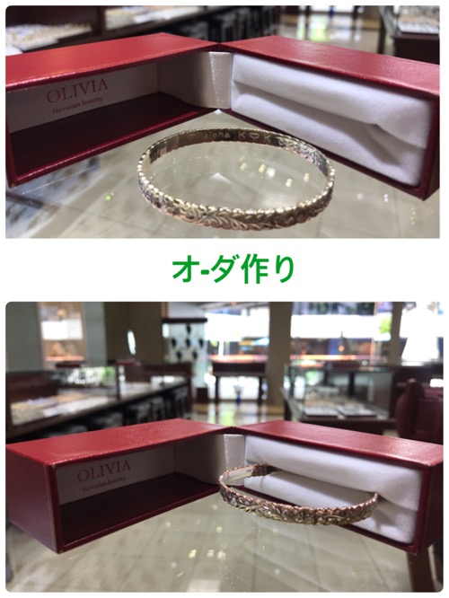 3とんゴルドにモンステラ…好きなハワイアン彫り内側にメッセージ彫りハワイ旅行記念にオリジナルハワイアンバングルオ-ダ作りですね❣️