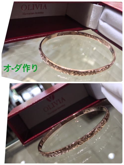 結婚指輪ハワイアン指輪日本からオ-ダ作り新婚旅行にピンクゴルドバングルに席入れちゃ日にち彫りオ-ダ作りバングルですね〜❣️