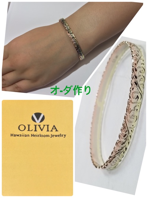 3トンピンクグリーンとWhiteゴルド色に好きな彫りオ-ダ作り内側にメッセージも彫りましたー綺麗でにバングルもっと綺麗に見えますね〜❣️