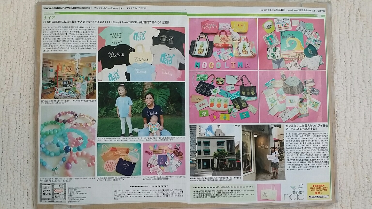 いつも、ありがとうございますnaiaです(∩_∩) ゴールデンウィークも後半、ショッピングの参考に 役立つカウカウマガジン!!! naiaは、頑張って2ページ掲載中です↖(^▽^)↗ ハワイ限定naiaオリジナルTをはじめ、ばらまきお土産、又多数ハワイ在住ローカルアーティストの作品、見逃せないnaiaでしか購入できないアイテムがた~くさん!! (★^O^★)!! カウカウマガジンと共に、お気軽のお越しを心よりお待ちいたしております… Tギャラリアトロリー乗り場向かい 345ビル 三階 naia