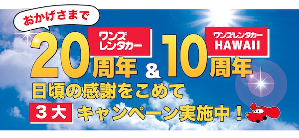 お店の画像 お気に入り0 SHARE お気に入り0 SHARE 店舗情報へ すべて(23) 商品・サービス(23) 外観・内観( 0 ) Close 当日貸し出しOK! お電話1本でラクラク♪レンタル♪ Close 4人以上のグループにぴったりのミニバン。お買い物、大荷物も安心♪ Close ワイキキシーサイド通りに移転しました! Close ハワイの思い出を投稿!ワンズレンタカーハワイフォトコンテスト! 最優秀賞:100,000円分旅行券 1名様審査員特別賞:50,000円分旅行券 1名様佳作:ハワイスタッフが選ぶ旅の思い出お土産詰め合わせ 20名様■キャンペーン期間2025年12月1日~2026年3月31日■応募条件日本国内在住の方キャンペーン期間中にワンズレンタカーハワイをご利用いただいたお客様に限ります。ご出発時にお渡しする「うちわ」と共に、ハワイ旅行中に写真をお撮りの上、ご応募ください。 ■詳しくはこちらから。https://www.ones-rent.com/static/hawaii10years/ Close 3日連続利用で乗り捨て料金無料! 例えば空港店で車を借りて、ワイキキ店で返却するということも可能!3日連続でレンタルされる方はその際の乗り捨て料金が無料になります。 Close 【コンパクト】 日産ノート(車種指定不可)。5人乗。小回りの鬼!細い道も安心! Close 【コンパクト】 トヨタ ヤリス(車種指定不可)。5人乗。運転しやすさNo.1◎ Close 【ミドルサイズ】 日産バーサ。5人乗。荷物がたっぷり入る広々トランク! Close 【フルサイズ】 日産アルティマ。5人乗。ゆったり乗車、ゆったりトランク! Close 【プリウス】 5人乗。燃費良くガソリン代節約◎ Close 【プリウス】 5人乗り。日本と同じ快適さをハワイでも。 Close 【オープンカー】 マスタング。4人乗り。ハワイの風と太陽を満喫するならコレ! Close 【オープンカー】 カマロ。4人乗。やっぱ憧れ、カマロでハワイをツーリング! Close 【ミニバン(7人乗)】 5人以上のグループ・家族に◎荷物も人もたくさんフィット! Close 【ミニバン(8人乗)】 ワイケレ爆買い、たっぷり大荷物・大人数もお任せあれ! Close ヤッパリ安心、信用の日本語でご予約時〜ご返却時まで承ります! Close アラモアナホテル内にも店舗をオープン! Close ノースショアのハレイワに行くなら 東海岸からのドライブを楽しんで、オープンカーがオススメ! Close カメビーチ、ラニアケアビーチに行くなら ミニバンで長旅も安心! Close カイルア、ラニカイに行くなら駐車場のことも考えて、 小回りが利くコンパクトカーがオススメ! Close ワイケレ・プレミアム・アウトレット ゆったりミニバンがオススメ! Close ヒストリックタウンのダウンタウンやカカアコなどタウンに行くなら ハイブリットカーがオススメ! Close 戦艦ミズーリ、パールハーバーにいくなら ミドルカーで、フットワーク軽く!周りのショッピングセンターなどもチェックして回ろう! Close 当日貸し出しOK! お電話1本でラクラク♪レンタル♪ Close 4人以上のグループにぴったりのミニバン。お買い物、大荷物も安心♪ Close ワイキキシーサイド通りに移転しました! Close ハワイの思い出を投稿!ワンズレンタカーハワイフォトコンテスト! 最優秀賞:100,000円分旅行券 1名様審査員特別賞:50,000円分旅行券 1名様佳作:ハワイスタッフが選ぶ旅の思い出お土産詰め合わせ 20名様■キャンペーン期間2025年12月1日~2026年3月31日■応募条件日本国内在住の方キャンペーン期間中にワンズレンタカーハワイをご利用いただいたお客様に限ります。ご出発時にお渡しする「うちわ」と共に、ハワイ旅行中に写真をお撮りの上、ご応募ください。 ■詳しくはこちらから。https://www.ones-rent.com/static/hawaii10years/ Close 3日連続利用で乗り捨て料金無料! 例えば空港店で車を借りて、ワイキキ店で返却するということも可能!3日連続でレンタルされる方はその際の乗り捨て料金が無料になります。 Close 【コンパクト】 日産ノート(車種指定不可)。5人乗。小回りの鬼!細い道も安心! Close 【コンパクト】 トヨタ ヤリス(車種指定不可)。5人乗。運転しやすさNo.1◎ Close 【ミドルサイズ】 日産バーサ。5人乗。荷物がたっぷり入る広々トランク! Close 【フルサイズ】 日産アルティマ。5人乗。ゆったり乗車、ゆったりトランク! Close 【プリウス】 5人乗。燃費良くガソリン代節約◎ Close 【プリウス】 5人乗り。日本と同じ快適さをハワイでも。 Close 【オープンカー】 マスタング。4人乗り。ハワイの風と太陽を満喫するならコレ! Close 【オープンカー】 カマロ。4人乗。やっぱ憧れ、カマロでハワイをツーリング! Close 【ミニバン(7人乗)】 5人以上のグループ・家族に◎荷物も人もたくさんフィット! Close 【ミニバン(8人乗)】 ワイケレ爆買い、たっぷり大荷物・大人数もお任せあれ! Close ヤッパリ安心、信用の日本語でご予約時〜ご返却時まで承ります! Close アラモアナホテル内にも店舗をオープン! Close ノースショアのハレイワに行くなら 東海岸からのドライブを楽しんで、オープンカーがオススメ! Close カメビーチ、ラニアケアビーチに行くなら ミニバンで長旅も安心! Close カイルア、ラニカイに行くなら駐車場のことも